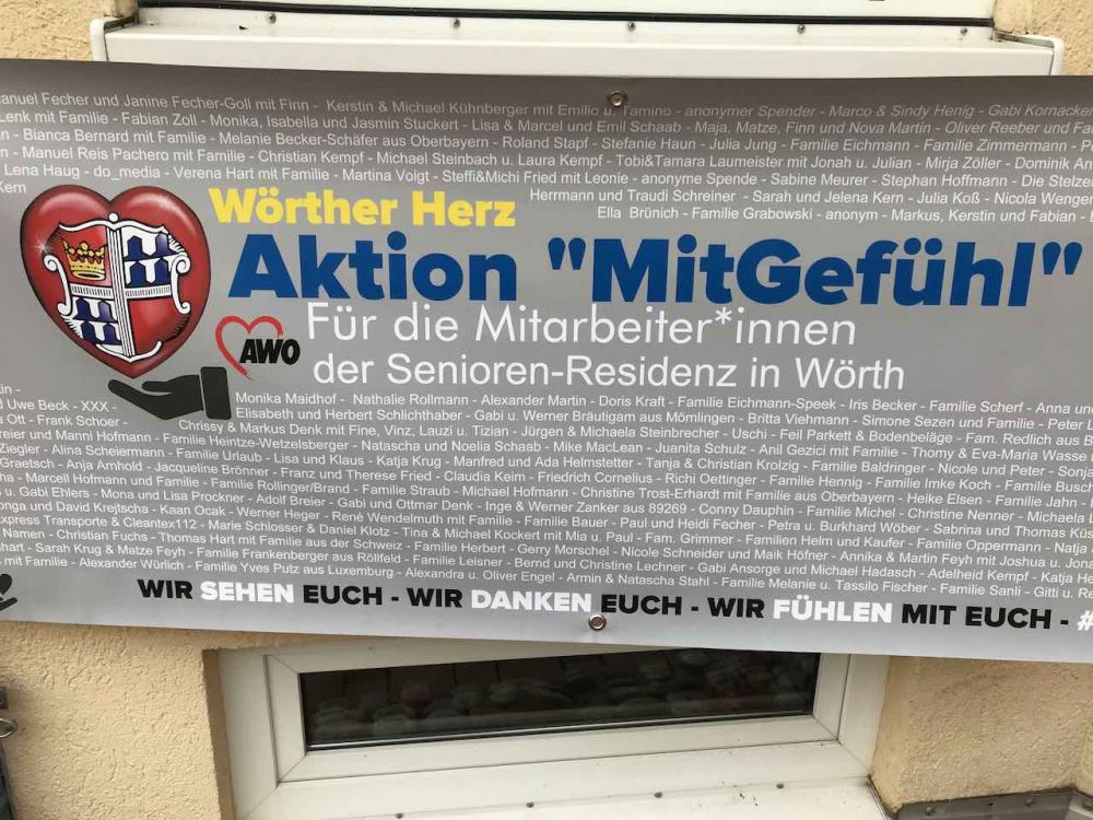 Das "Wörther Herz" ist eine von städtischen Kinder- und Jugendbeauftragten gegründete Initiative, um der Kinder- und Altersarmut entgegenzuwirken, von der auch Mitbürger aus der idyllischen Ortschaft betroffen sind. Den Initiatoren war es daher eine Herzensangelegenheit, unserer gesamten Belegschaft eine Freude zu bereiten – als Dank und Wertschätzung für die täglich geleistete Löwenarbeit gegen die Corona-Pandemie. So wurde die Aktion "MitGefühl" gemäß dem Motto "von Wörth für Wörth" ins Leben gerufen und eine Facebook-Spendenaktion mit PayPal MoneyPool gestartet. Ziel war es, 140 Unterstützer für die 140 Mitarbeiter unserer Residenz zu gewinnen. Knapp drei Tage später war die Unterstützerliste länger als erhofft und die angepeilte Spendensumme konnte sogar mehr als verdoppelt werden. Somit durfte die Überraschung dank der erzielten 1.755 € an Spenden dann doch etwas größer ausfallen als ursprünglich geplant.